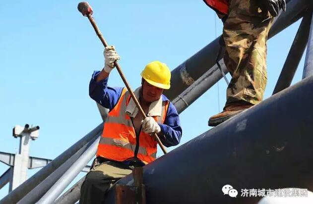 9月8日上午,濟南西部會展中心項目的第一榀(pǐn,屋架量詞)屋面鋼結構桁架吊裝完成,五號展館的鋼結構主體雛形初現,濟南西部會展中心的建設步伐又推進了扎實一步。