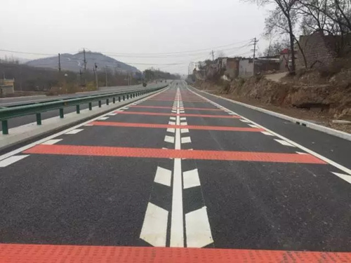 工程路線設(shè)計(jì)考慮人、車、路、環(huán)境四大要素,體現(xiàn)了以人為本的差異化設(shè)計(jì)理念。項(xiàng)目優(yōu)化調(diào)整了路線指標(biāo),沿線除設(shè)置縱向振動(dòng)標(biāo)線外,橫向還設(shè)置了更加醒目的紅色振動(dòng)標(biāo)線,既提高了車輛行駛的安全性,又提升了標(biāo)線視覺上的警示功能。