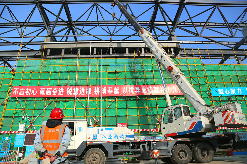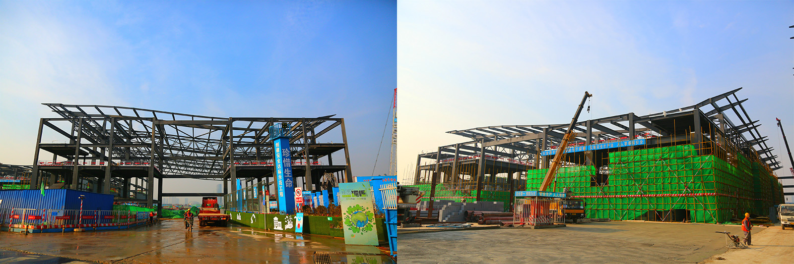 目前,展館區域四號館與五號館的鋼結構主體及北塔結構施工均已完成,正在進行砌體施工,一至三號展館鋼結構吊裝正全面進行中。展館區鋼結構累計完成吊裝1.5萬噸,占總量的21%。旋轉坡道部分-0.1~6.8m結構施工、6.8~13.7m結構架體安裝均已完成。