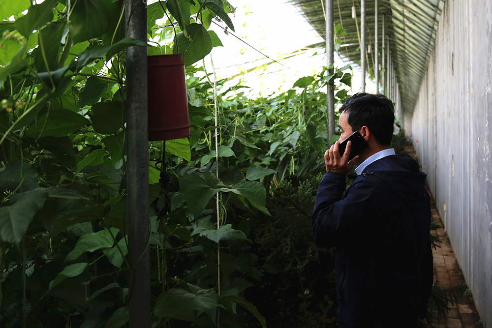 7:30當我們到達陳德國所在的大棚區時,他已經工作了一個小時。“像這種老葉、黃葉要抓緊摘掉了,到了一定年限就只吃飯不干活,影響光合作用。”在蕓豆種植棚,陳德國正在電話指導著種植戶。