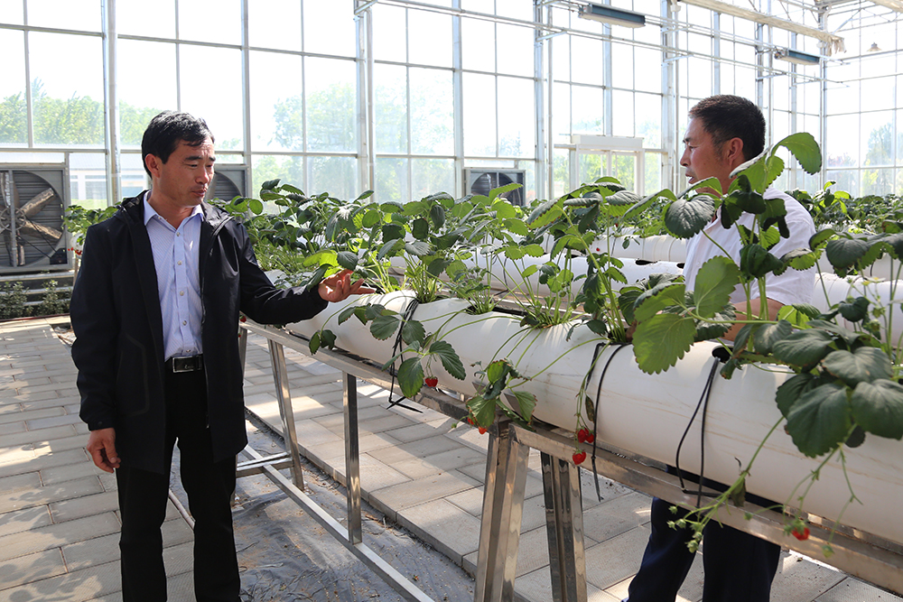 在連棟溫室里,陳德國察看前期做育苗試驗的情況。“草莓在這里第一年的種植效果就很好,原因在于前期我們吸取教訓,在這些塑料管子下面打孔處理,管內放著陶粒和紗窗,給原有設備增加了透氣性。”陳德國解釋道。