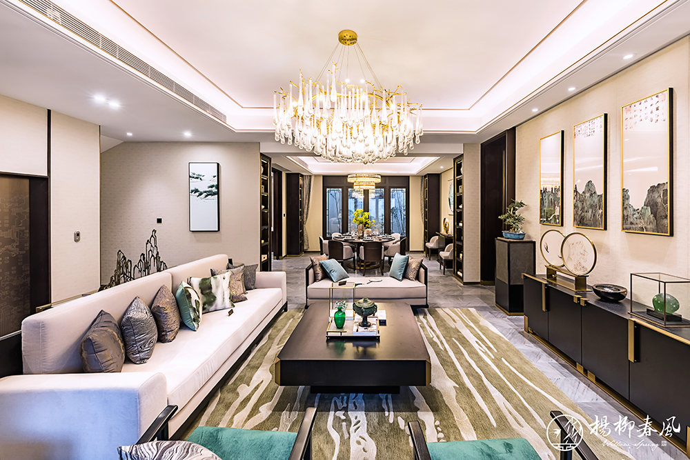 另一套大戶型樣板房采用新中式風(fēng)格,以儒家思想為依托,通過大理石、金屬銅、木材的有機(jī)結(jié)合,體現(xiàn)主人的穩(wěn)重、尊貴和優(yōu)雅。約110㎡的大面積庭院,演繹著四季不落幕的錦繡風(fēng)光;挑高約5.7米的地下空間,讓格調(diào)生活隨心定制。整套樣板房抒寫著文雅靈動的東方氣韻,展現(xiàn)了“中正和雅”的國風(fēng)意境。
