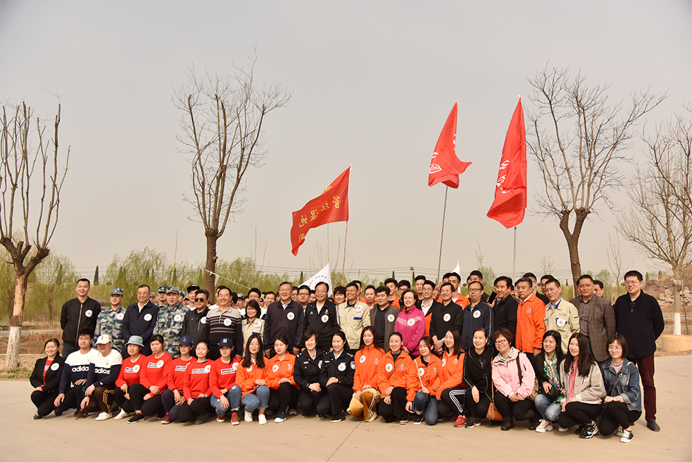 植樹現場大家繁忙有序、干勁十足,在技術人員專業指導下,一部分同志穿戴各自的工裝、迷彩服,揮舞著自己的隊旗,佩戴著“造綠濟南,志愿奉獻”的LOGO徽標,鏟土挖坑、扶苗栽樹;還有一部分同志對去年栽種的100多棵北美海棠樹進行培土、澆水、剪枝,并對周邊的垃圾進行拾撿清理為內容的“回頭看”勞動。在大家共同努力下,經過一個半小時的忙碌。共栽植近200余棵木槿樹。