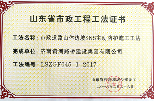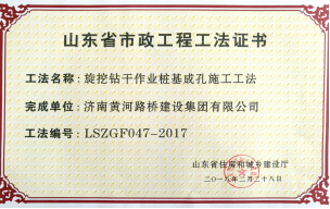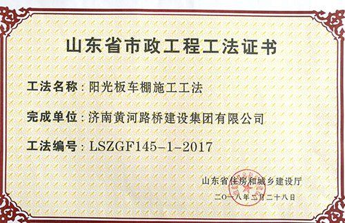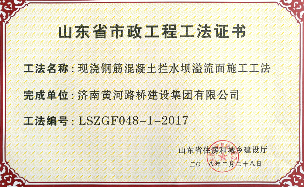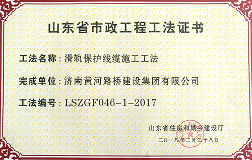 2018年2月28日,濟南黃河路橋建設集團公司申報的6項工法全部被山東省住房和城鄉建設廳批準為山東省市政工程工法。