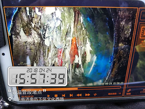 應急搶險小組立即制定搶險計劃,使用管道潛望鏡等檢測設備對冒溢原因進行排查,經排查初步判定為下游管口阻塞造成,由于現場處于綠化帶內,機械設備無法進入,搶險小組根據實際情況現場設計焊接作業工具,配合管道潛望鏡對管道進行人工掏挖,經過4個小時的清理,將管道內部分垃圾清除,首先確保檢查井停止冒溢。但經過管道潛望鏡再次查看發現管道內依然存在40*20*15cm、60*20*15cm立沿石兩塊無法完全清除,后期仍存在冒溢風險,為確保管網長期正常運行,搶險小組當機立斷制定人工下井作業清除方案,務必將阻塞點徹底清除掉。