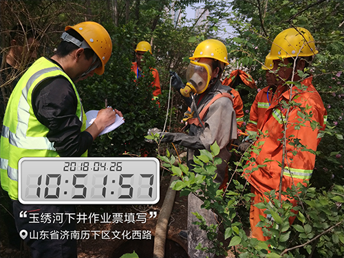 由于人工下井作業危險較大,方案制定完成后搶險小組立即向公司安全質量部進行匯報,經過安全質量部批準于4.26日進行人工下井作業。現場工作人員嚴格按照下井作業施工流程,認真填寫《下井作業票》、《有限空間作業票》等最終將工作人員將阻塞在管口的立沿石等阻塞物取出,管道又恢復了正常運行,玉繡河也恢復了往日的清澈。