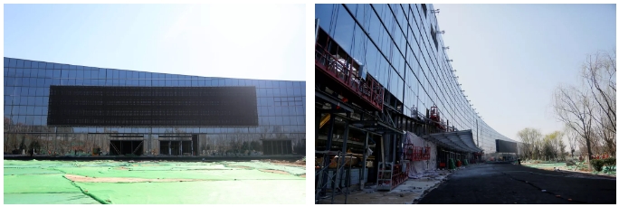 項目建成后,主入口位于展館西側(cè)的共享大廳,南北向的5個展館通過共享大廳相通,目前共享大廳的玻璃幕墻已安裝完畢,每塊玻璃都按照固定編號依次安裝,不同弧度的玻璃面完美拼接,將大廳的流動設(shè)計感盡顯無疑。共享大廳外立面的LED大屏頗為搶眼,高約8米、長約43米的LED大屏日后將用于不同展館布展介紹情況等宣傳使用。在室外部分,正在進行廣場綠化和管道鋪設(shè)等施工,工人們有條不紊地完善著室外施工細節(jié)。
