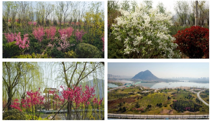 在華山歷史文化濕地公園一期內,湖邊碧桃、海棠、櫻花等樹木盛開,連翹燦爛,色彩斑斕,步移景異,快車道旁草木叢生,丁香花開沁人心脾,蜂蝶相伴,生機勃勃,吸引眾多市民游客前來游玩賞花。