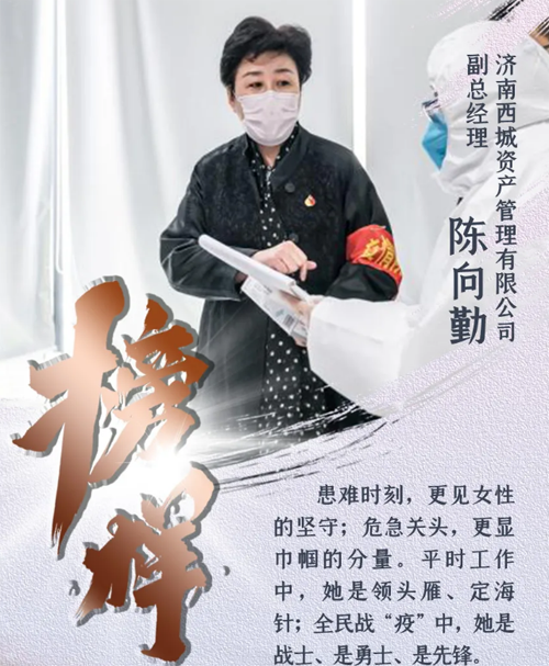 目前,濟南全面復工復產,陳向勤對疫情防控工作進行再部署、再強調、再落實,做到“十個一律”、“十個嚴禁”。她提前出手、摸底調查,切實堅守聯防聯控嚴密防線,幫助運營單位制定應對措施,關鍵時刻施以援手,保障復工復產后資產管理公司所轄寫字樓、商業綜合體的疫情防控工作萬無一失。