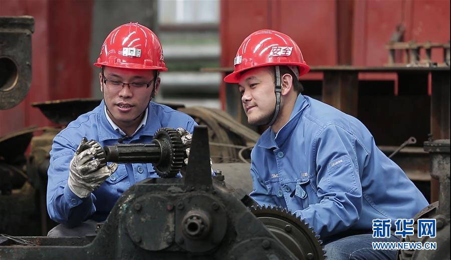 全國人大代表、山西焦煤西山煤電杜兒坪煤礦的董林(左)為職工講解設備構造和傳動原理(2018年4月25日攝)。新華社發