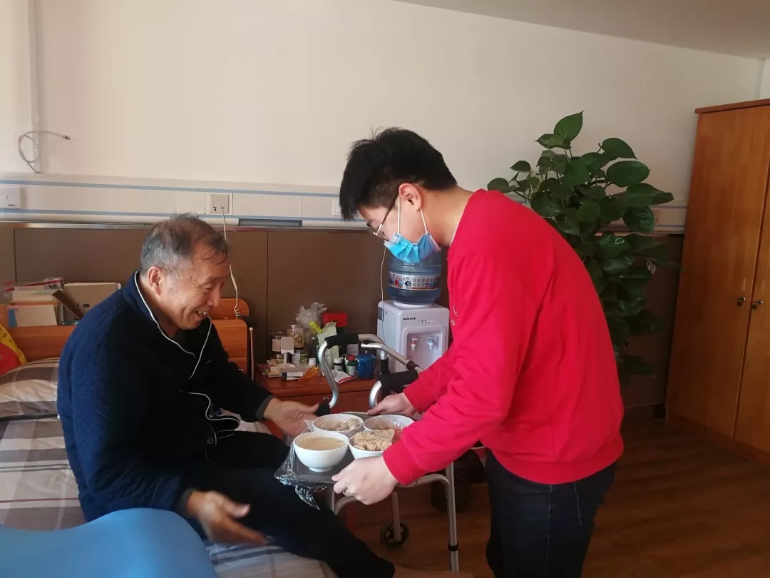 在介護(hù)區(qū),我們還看到了兩位正在忙碌的“95后”小伙子。97年出生的陳安義,家住德州,本來(lái)已經(jīng)買(mǎi)好了回家的車(chē)票,接到抗擊疫情的通知,第一時(shí)間退了車(chē)票主動(dòng)請(qǐng)戰(zhàn)。98年出生的欒希浩,老家在煙臺(tái),也是放棄了春節(jié)假期,跟陳安義兩人共同負(fù)責(zé)介護(hù)區(qū)二樓的四戶(hù)長(zhǎng)者。