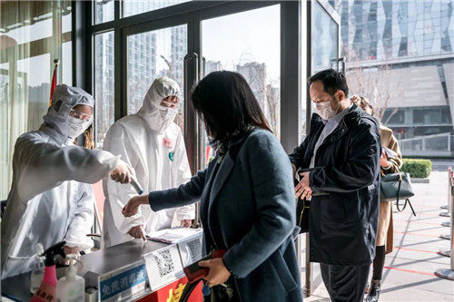 時間倒回至2月25日,蒙蒙細雨中,6位要參會的同志被“攔”在大廈門口,經過防疫人員的“盤查”和測體溫等多個程序才得以進入大廈。然而差點被拒之門外的他們不僅沒有怨言,反而盛贊“六親不認”的一線防疫人員和資產公司嚴格的防控舉措。