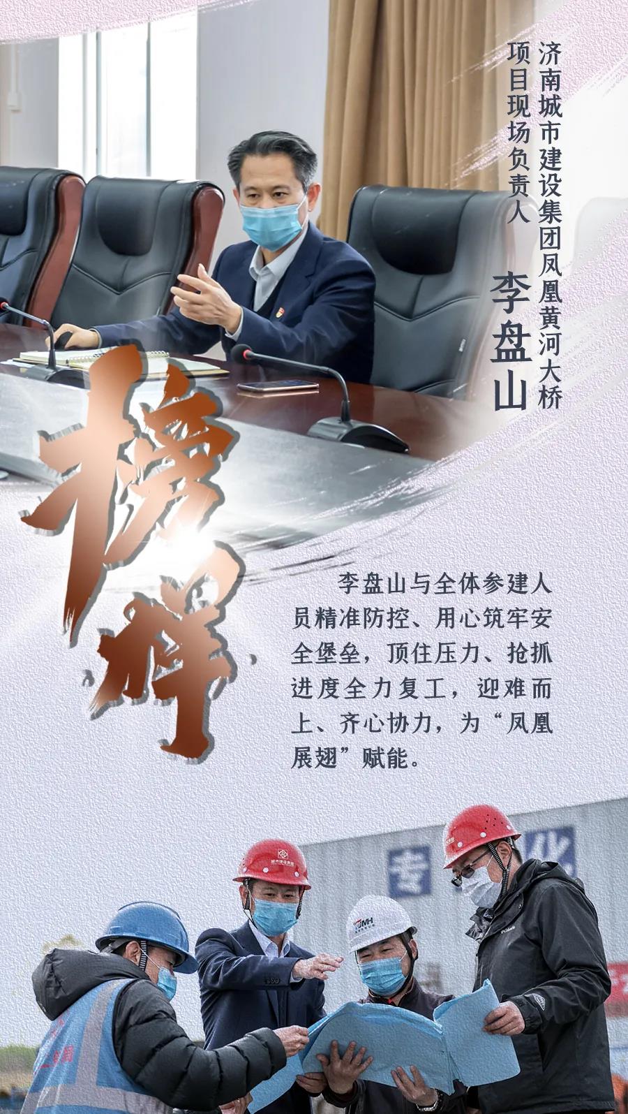 陽春三月,兩岸新綠。鳳凰黃河大橋施工現(xiàn)場,各施工區(qū)域熱火朝天、作業(yè)正忙。自項目全面復(fù)工以來,1000多名工人日夜奮戰(zhàn)一線,在做好疫情防控工作基礎(chǔ)上,項目建設(shè)各項工作全速推進。作為濟南城市建設(shè)集團鳳凰黃河大橋項目現(xiàn)場負責人,李盤山與全體參建人員精準防控、用心筑牢安全堡壘,頂住壓力、搶抓進度全力復(fù)工,迎難而上、齊心協(xié)力,為“鳳凰展翅”賦能。