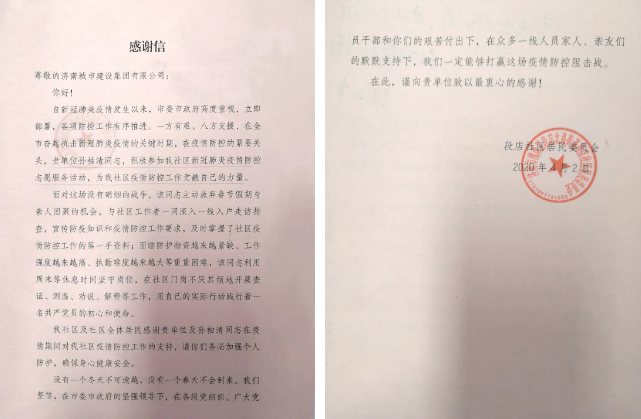 近日,一封來自槐蔭區段店社區居民委員會的感謝信發至濟南城市建設集團,感謝信的“主角”是集團所屬華誼兄弟(濟南)電影城投資開發有限公司的孫袖清同志。新型冠狀病毒肺炎疫情發生以來,孫袖清放棄春節假期和周末休息時間,個人主動聯系報名,積極參與社區疫情防控志愿服務工作,以實際行動彰顯黨員和建設集團人責任擔當,用無私奉獻展現一名“80后”的青春力量,與社區工作人員共同筑牢社區疫情防控安全線。
