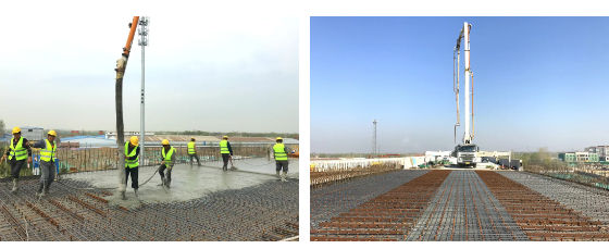 該標(biāo)段全線10kV以上高壓線共計(jì)15條影響主線2400米施工,項(xiàng)目部多措并舉順利攻克難關(guān),大力推進(jìn)施工進(jìn)展。自項(xiàng)目開工以來(lái),北岸引橋4#墩一直受上空高壓電纜制約施工,項(xiàng)目部多次勘探現(xiàn)場(chǎng),編制專項(xiàng)施工方案。樁基鉆孔采用循環(huán)鉆開挖,為避免觸電危險(xiǎn)的發(fā)生,設(shè)備上方鋪蓋絕緣板后施工;扣除吊裝高度,樁基鋼筋籠全部采用2米一段,于鉆孔內(nèi)進(jìn)行連接拼裝;線改后為了迅速形成強(qiáng)度,4#墩下部結(jié)構(gòu)混凝土強(qiáng)度標(biāo)號(hào)提升至C40。