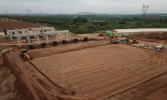 大東環二標段路基總挖方223.77萬方,總填方309.7萬方。為了確保項目建設的順利進行,項目部及早安排部署,從2018年底正式開展路基施工,從測量放樣、原地面清表、挖土方、填土方等各個環節都做到有條不紊、有序推進,積極利用有利天氣,挖掘機、推土機、壓路機等來回穿梭轟鳴,并進行積極協調,確保各個工作面都有機械運轉,大大提高了施工速度,同時進行細節把控,路基邊部采用液壓夯補強、搭接部位鋪設土工格柵、軟土地基采取摻灰處理等,推進進度同時保證了工程質量。10月7日完成全部路基施工任務。