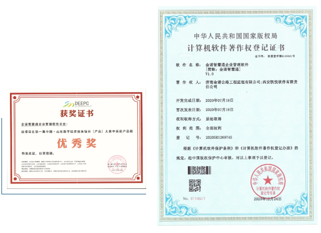 2020年,金諾公司與西安凱悅軟件有限責任公司合作,研發(fā)了“金諾智慧通”企業(yè)管理軟件,于2020年12月取得中國版權保護中心頒發(fā)的軟件著作權登記證書。“金諾智慧通”參加了第一屆中國(山東)數(shù)字經(jīng)濟優(yōu)秀項目(產(chǎn)品)大賽,并獲得產(chǎn)品組“優(yōu)秀獎”。同時,2020年下半年推動的針對公路工程建設開發(fā)的“路面三維剖面破損(病害)自動檢測系統(tǒng)”、“橋梁在線監(jiān)測系統(tǒng)”等8個軟件已申報軟件著作權登記,軟件著作權登記證書已于2021年3月份下發(fā)。