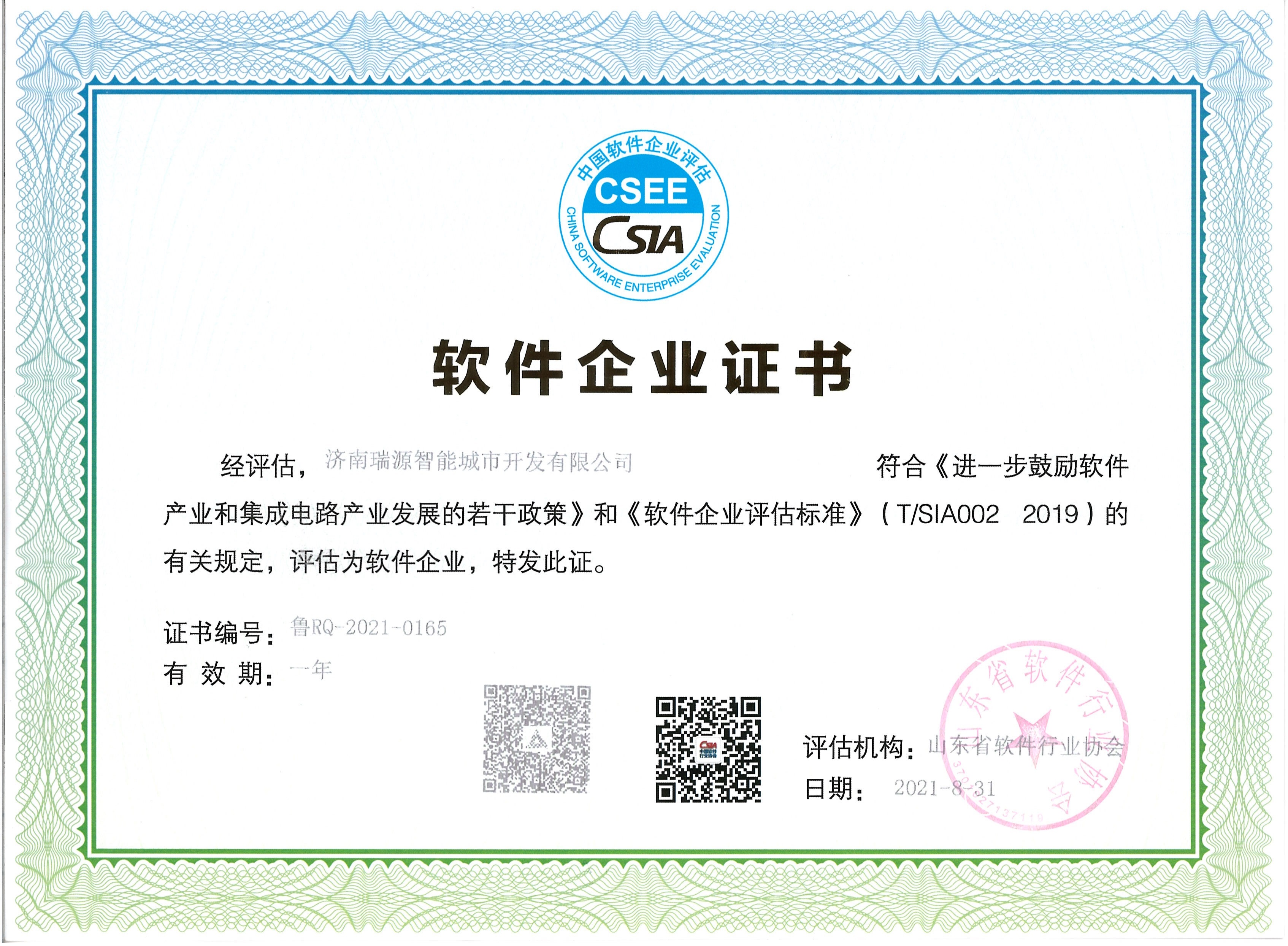 8月31日,濟(jì)南瑞源智能城市開(kāi)發(fā)有限公司經(jīng)山東省軟件行業(yè)協(xié)會(huì)評(píng)估,符合《進(jìn)一步鼓勵(lì)軟件產(chǎn)業(yè)和集成電路產(chǎn)業(yè)發(fā)展的若干政策》和《軟件企業(yè)評(píng)估標(biāo)準(zhǔn)》的有關(guān)規(guī)定,獲評(píng)軟件企業(yè)證書(shū)。此證書(shū)獲得,標(biāo)志著公司在技術(shù)研發(fā)、軟件應(yīng)用等相關(guān)領(lǐng)域獲得了行業(yè)認(rèn)證資質(zhì),更是對(duì)公司技術(shù)先進(jìn)性和前沿性的充分認(rèn)可。