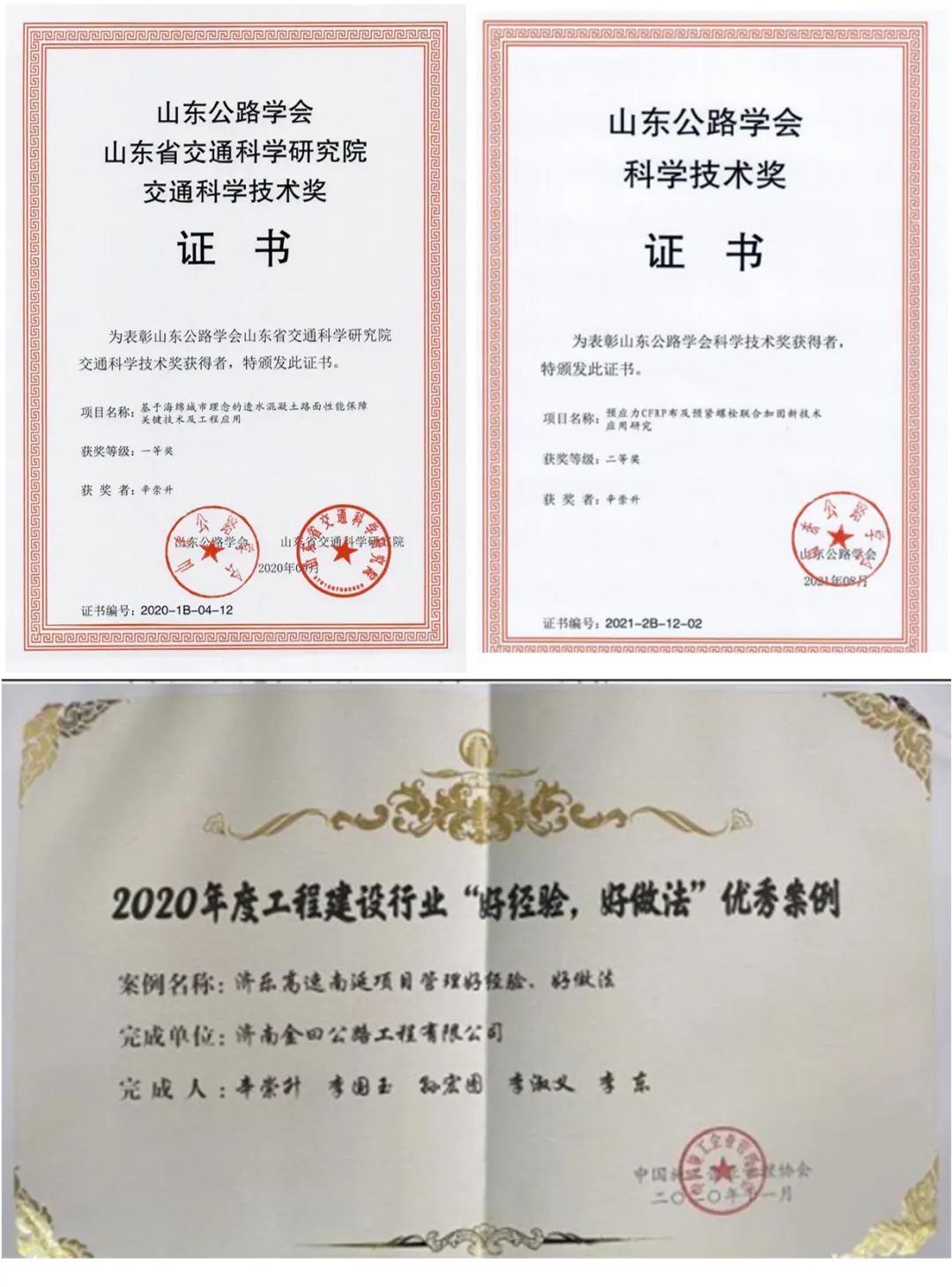 近年來,辛崇升同志先后取得了一級建造師(公路、市政)、試驗(yàn)工程師(公路、材料、橋梁、隧道)、注冊安全工程師等執(zhí)業(yè)證書。經(jīng)過多年的施工技術(shù)管理積累,先后將國內(nèi)外先進(jìn)技術(shù)(橋梁頂升、數(shù)控智能張拉、鋼管混凝土施工等)應(yīng)用于建設(shè)中,并撰寫了國家及省級工法,申報(bào)專利8項(xiàng),撰寫論文5篇,獲得山東公路學(xué)會(huì)科學(xué)技術(shù)獎(jiǎng)2項(xiàng)。