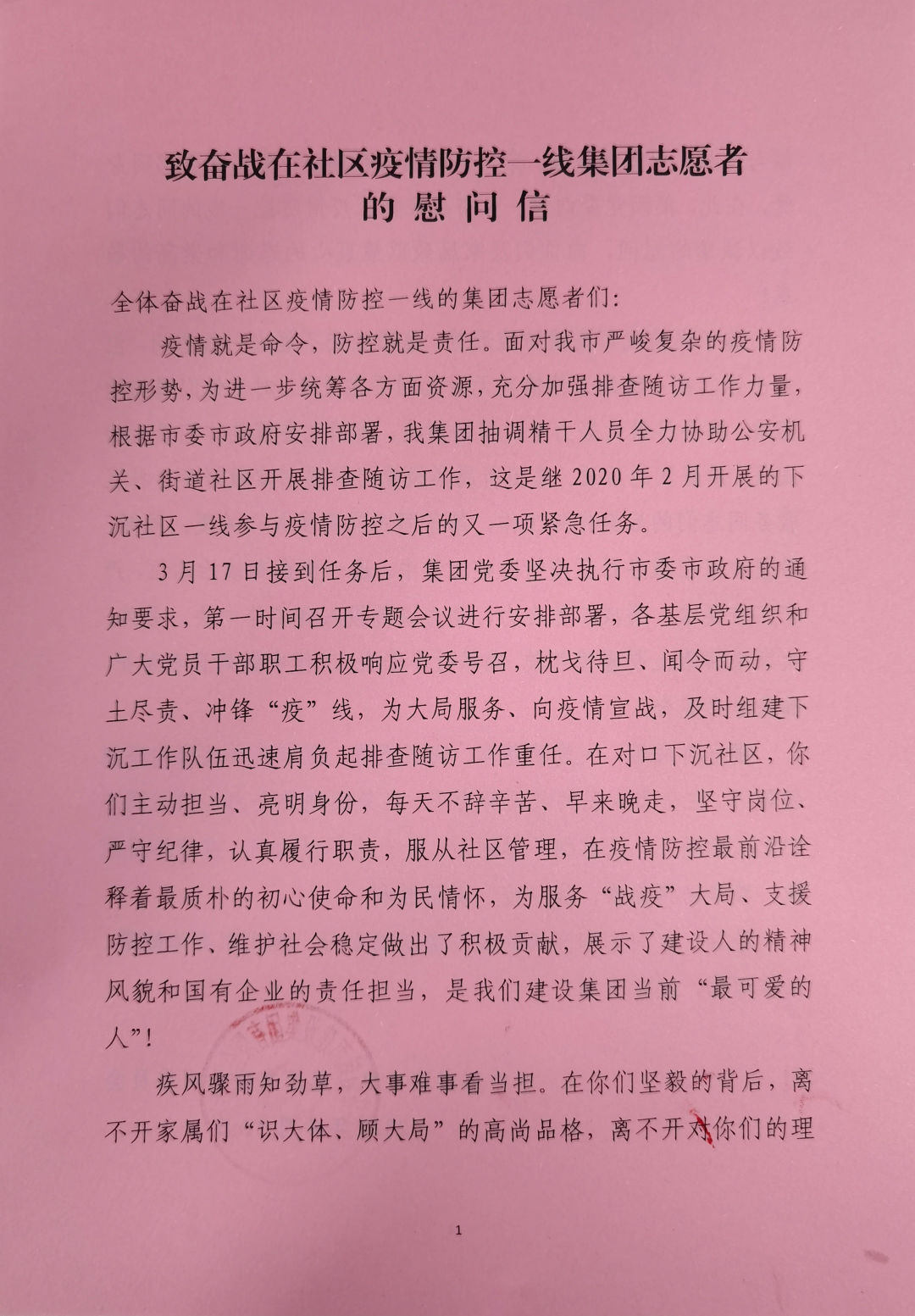 鑒于當前我市疫情防控形勢,集團黨委不能去一線慰問,但對于你們在一線的工作情況無時無刻不在關注,對于你們遇到的困難,將會盡最大努力予以幫助解決,集團黨委就是你們最大的底氣、最堅實的后盾。集團所屬各級黨組織要切實做好參與社區(qū)服務同志們的后勤保障工作,給予同志們更多關心關愛。同時,希望大家在服務社區(qū)疫情防控工作中,進一步提高政治站位,嚴守工作要求,形成工作合力,全力以赴投入到工作中去。另外,大家來回路上要謹慎駕駛,確保行車安全;工作中做好自我防護,確保自身安全。
