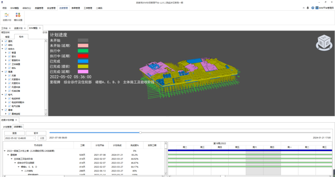 結合項目結構超限設計的實際,為從根本上解決因后澆帶設置過多而產生的進度、質量、安全文明問題,論證實施了“跳倉法”施工工藝,按“塊料規劃、塊料施工、分層澆注、整體成型”的原則施工,加大資源調配力度,在節約工期的同時,實現文明施工、質量控制、進度管理有益結合。深入推進BIM全過程管理應用,實現以BIM模型為基礎的三維圖紙審查、碰撞檢測、凈高分析、設計方案比選、施工模型深化、管線綜合、進度模擬、數據共享等功能,為施工方案編制論證、進度檢查反饋、圖紙審查評價等多方面提供了多維度的強大支持。