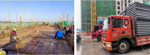項目整體實行閉環管理,工人生活區位于項目內部,從而保證項目封控期間各樓棟作業人員工種數量齊全,關鍵崗位不空缺,保障了項目生產“人力”。面對封控、材料供應、運輸困難等問題,項目部提早謀劃,現場優化布局,提前儲備關鍵物資,如鋼筋、預制構件、保溫板等材料,同時物料進出場進行專班管理,提前報備、專人接送、封條張貼、專人盯守、過渡區消殺等管控流程配合嚴密,保障了項目生產“物力”。