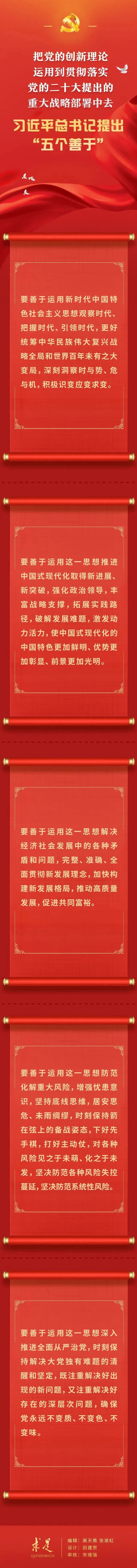 如何把黨的創新理論運用到貫徹落實黨的二十大提出的重大戰略部署中去?在2023年第10期《求是》雜志刊發的習近平總書記重要文章《在二十屆中央政治局第四次集體學習時的講話》中,總書記提出“五個善于”的明確要求。
