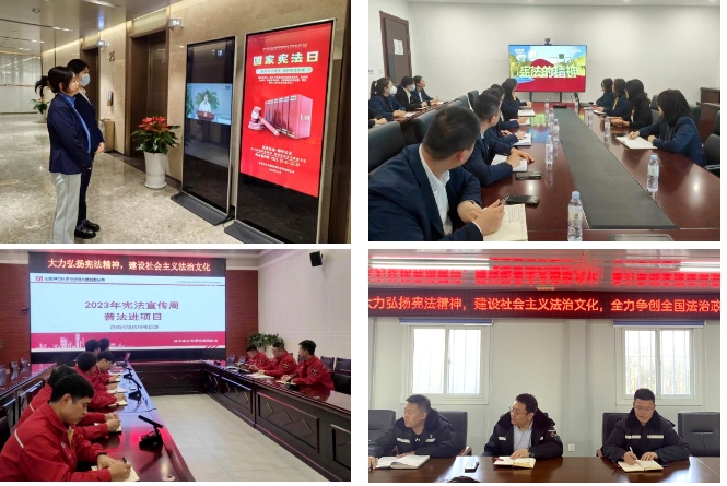 活動期間,集團在宣傳平臺開設(shè)“法治小課堂”欄目,推送《國家憲法日| 憲法和你的一生有什么關(guān)系?》《憲法宣傳周│“憲法知識知多少”專題測試》《憲法宣傳周│習(xí)近平法治思想應(yīng)知應(yīng)會(上)》《憲法宣傳周│習(xí)近平法治思想應(yīng)知應(yīng)會(下)》《憲法宣傳周│習(xí)近平法治思想專題測試》5篇普法推文,并通過集團電子屏投放憲法宣傳海報,營造濃厚活動氛圍。同時,集團積極組織各部室、子公司積極參與2023年全國 “憲法宣傳周”憲法知識網(wǎng)上競答活動,廣泛動員各子公司靈活采用線上、線下相結(jié)合的普法形式,大力加強習(xí)近平法治思想與憲法等內(nèi)容的學(xué)習(xí)宣傳。