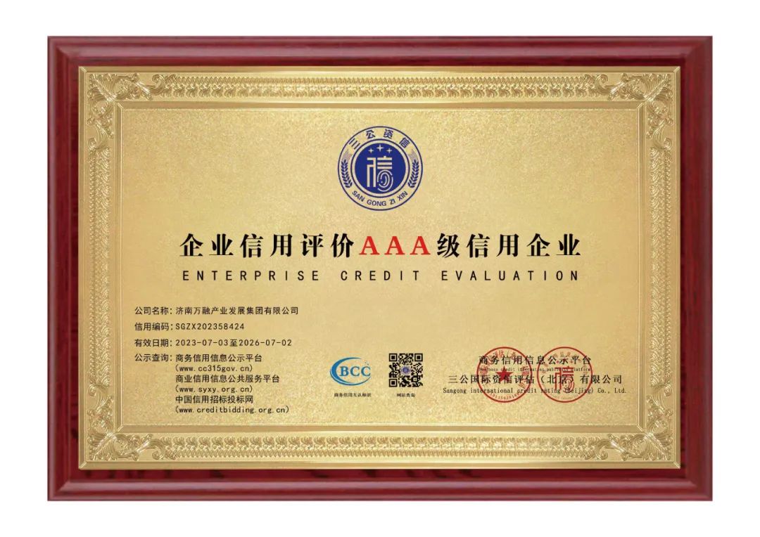 目前,公司擁有企業資信AAA等級證書、質量服務誠信企業AAA等級證書、重合同守信用企業AAA等級證書、誠信經營示范企業AAA等級證書、重質量服務守信用企業AAA等級證書、重服務守信用企業AAA等級證書、企業信用AAA等級證書、招投標領域立信五星企業、誠信企業家、誠信經理人、企業信用評價AAA級信用企業等信用認證。
