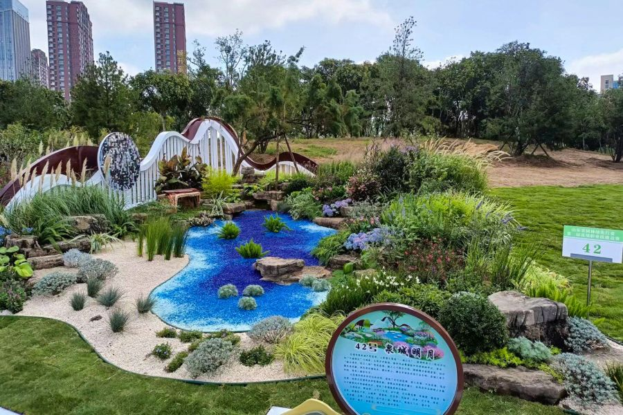 森泰園林參賽作品的設計靈感來源于元代畫家趙孟頫的《鵲華秋色圖》,設計理念以“鵲華千載,山河無垠”為主題,以山、水、詩詞、花卉為載體,以國風方式展現“齊風魯韻、花漾山東”,以花境打造山水文化田園。經過三天的花境施工,現場團隊克服工期短、任務重等困難,始終堅持高標準的花境打造,用匠心營造美麗,展現出季相色彩豐富,特色濃郁的低碳生態景觀。