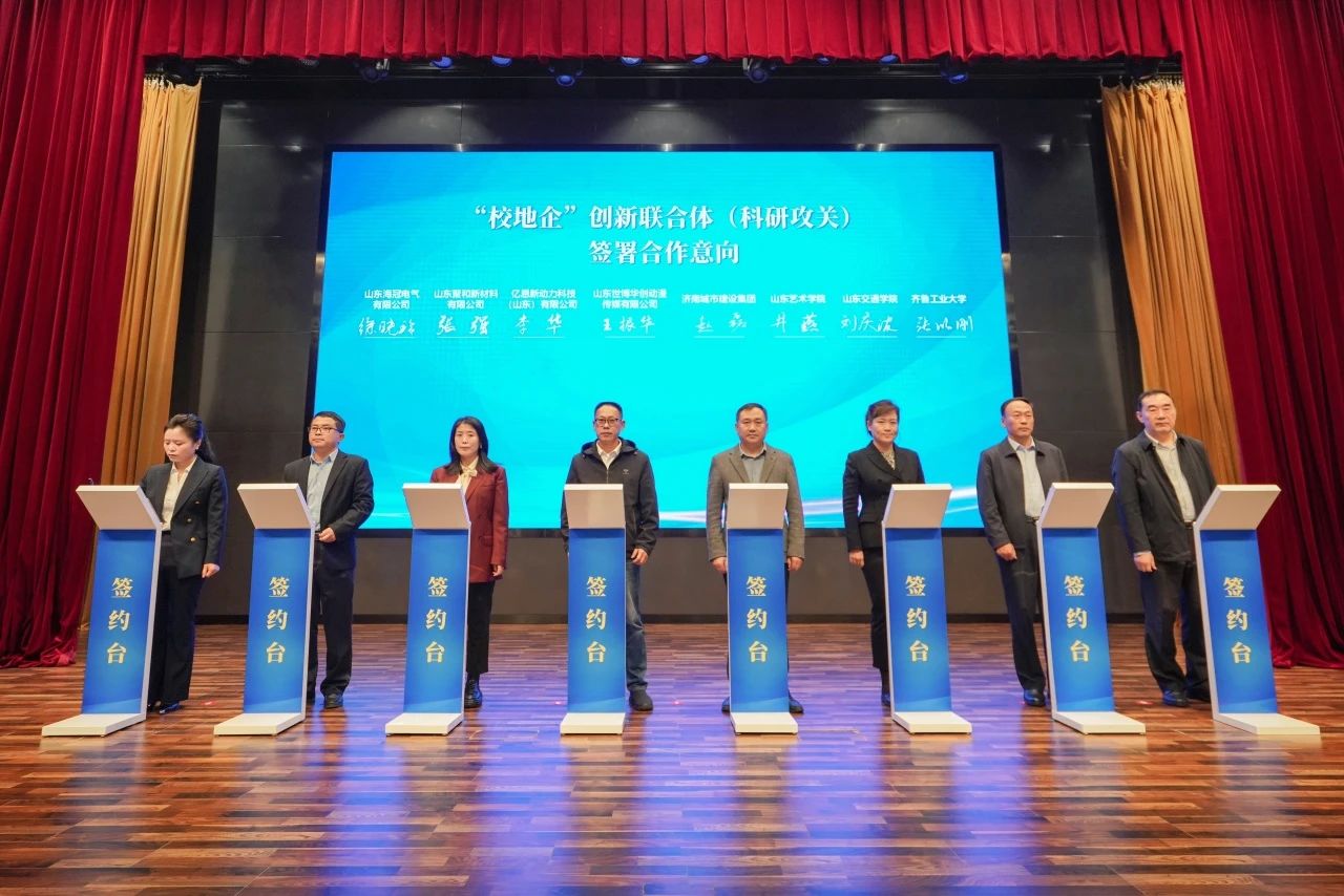 會(huì)上,建設(shè)集團(tuán)與齊魯工業(yè)大學(xué)、山東交通學(xué)院、山東藝術(shù)學(xué)院等7家單位簽訂合作意向書;集團(tuán)所屬山東金宇信息科技集團(tuán)有限公司作為“校地企”創(chuàng)新聯(lián)合體(科研攻關(guān))成員單位進(jìn)行路演。