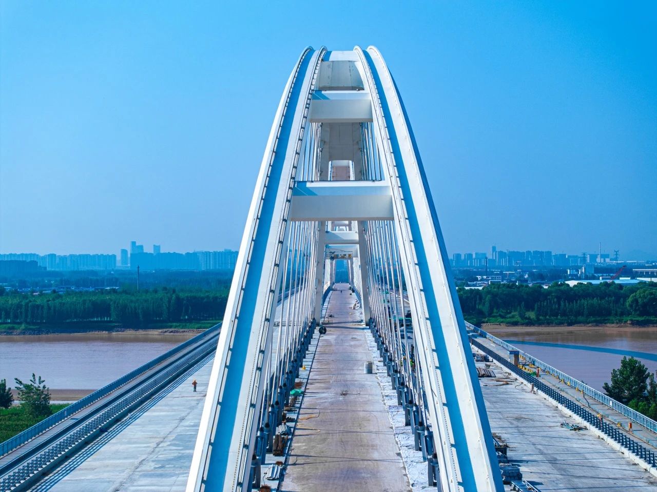 齊魯黃河大橋主橋?yàn)?ldquo;公軌同層,軌道居中”,雙向八車(chē)道一級(jí)公路標(biāo)準(zhǔn),主橋鋼箱梁寬60.7米,是世界最大跨度、最寬鋼箱梁、最高應(yīng)力幅拉索的下承式組合梁網(wǎng)狀系桿拱橋。同時(shí),濟(jì)南黃河齊魯大橋跨黃河特大橋?qū)⒐贰④壍澜煌ā⑷诵械篮头菣C(jī)動(dòng)車(chē)道同層共建,實(shí)現(xiàn)了橋位資源和土地的集約化利用,減少了對(duì)河道和環(huán)境的干擾,降低了工程成本。