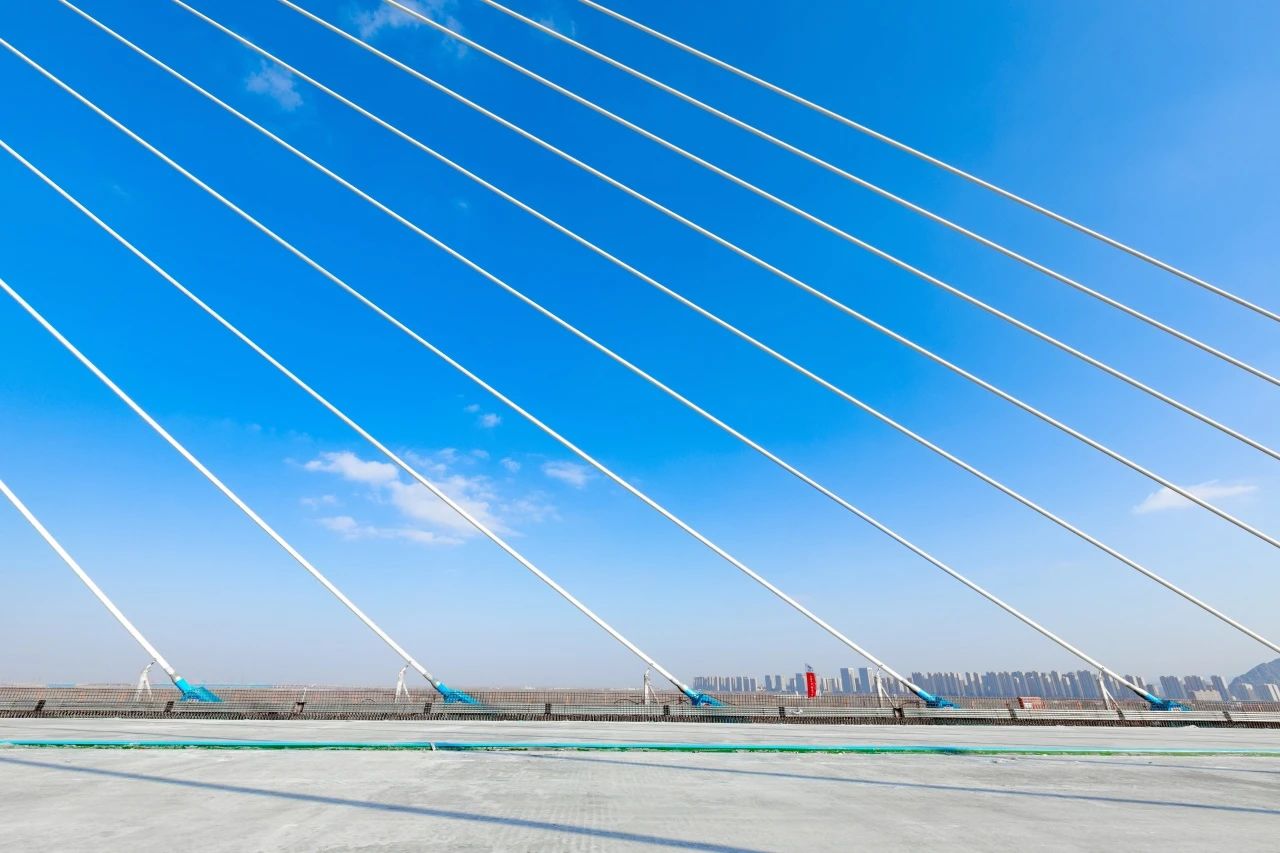 項(xiàng)目推進(jìn)中研發(fā)了超寬組合梁斷面、智能化無(wú)人值守頂推技術(shù)、高疲勞性能拉索體系等創(chuàng)新技術(shù),采用標(biāo)準(zhǔn)化設(shè)計(jì)、工廠化制造、裝配化施工。大橋采用鋼橋面+UHPC超高性能混凝土組合,大幅提高了鋼杯面的抗疲勞壽命;斜拉索采用1860MPa環(huán)氧涂層鋼紋線,具有獨(dú)特的四層保護(hù)措施,耐久性好,使用壽命長(zhǎng)。