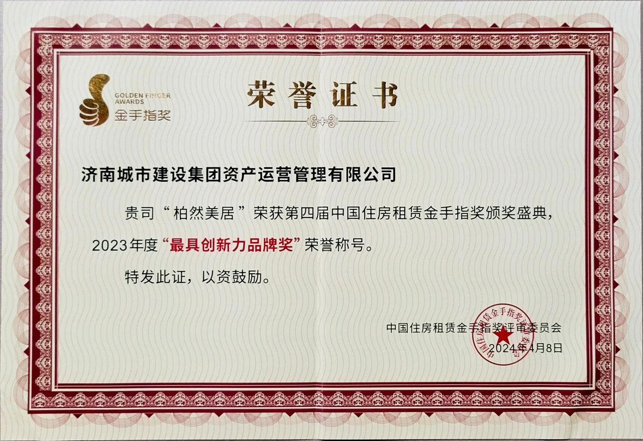 近日,在2024中國住房租賃企業家領袖峰會暨第四屆白云山論壇上,公布了2023年度“推動中國住房租賃發展進程”系列榜單,濟南城市建設集團資產運營管理有限公司成功上榜2023年度“推動中國住房租賃發展進程”百強企業,公司運營的保障性租賃住房“柏然美居”品牌榮獲2023年度“最具創新力品牌獎”榮譽。