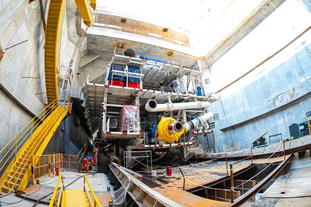 目前,“山河號”盾構(gòu)機一號臺車已下井,重510噸,長約30米,是“山河號”盾構(gòu)機后配套臺車中最大、最關(guān)鍵的一節(jié)。整個后配套臺車為三層框架結(jié)構(gòu),搭載盾構(gòu)機掘進(jìn)的主要設(shè)備,配置有盾構(gòu)機駕駛室、供電設(shè)施、泥漿環(huán)流系統(tǒng)組件、液壓泵站組件和同步雙液注漿系統(tǒng)組件,吊裝施工以后、中、前的順序,由800噸履帶吊從始發(fā)井端頭依次吊裝下井進(jìn)行組裝。