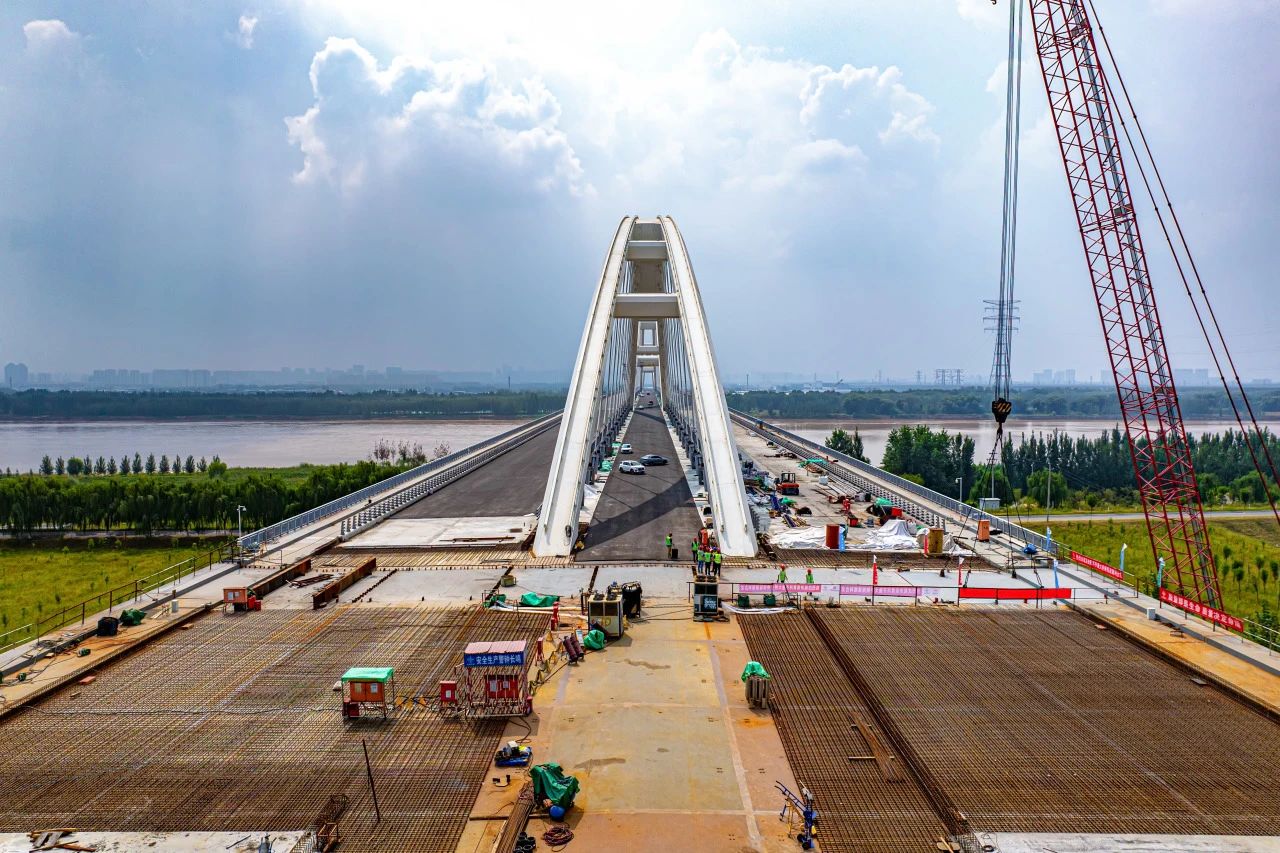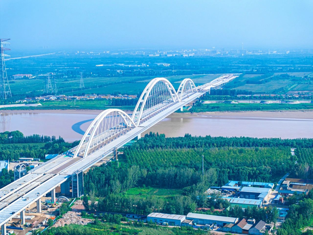 濟南黃河齊魯大橋為黃河之上首座下承式網狀系桿拱橋,主跨徑達420米、寬60.7m,創世界同類型橋梁最大跨徑、最大梁寬,其400Mpa超高應力幅拉索在橋梁建設領域首次研發應用。