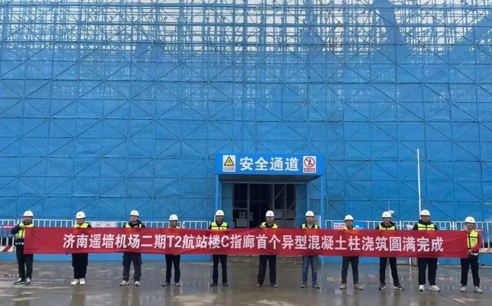 濟南機場二期改擴建工程T2航站樓工程,由濟南國際機場建設有限公司投資建設,總建筑面積約60萬平方米,平面布局為“集中航站樓+放射狀6指廊”構型設計。其中C指廊首個“樹杈”狀雙曲清水混凝土開花柱于近日完成澆筑。