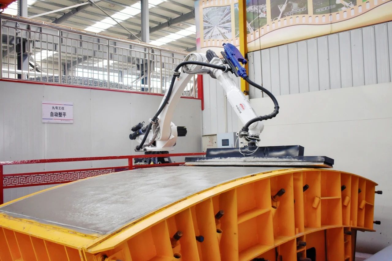 項目使用第五代超大直徑盾構管片綠色智能生產線,設置1條灌注線、3條養護線,實現了20余項關鍵技術革新,搭載清模、噴涂、收面、運載、管片掃描、鋼筋籠掃描等6種智能機器人,實現生產自動化、少人化,不僅減少了人工操作誤差,降低了安全風險,而且提高了作業效率,節約了生產成本。3套管片模型實現每天7環的產能,每日發運數量最高可達11環,其中發明螺旋筋固定裝置,投入使用后將合格率提升到99%;發明管片內、外弧面鋼板定位裝置,實施后預埋鋼板一次成型合格率提升16.6%,有效提高生產效率,減少材料浪費。